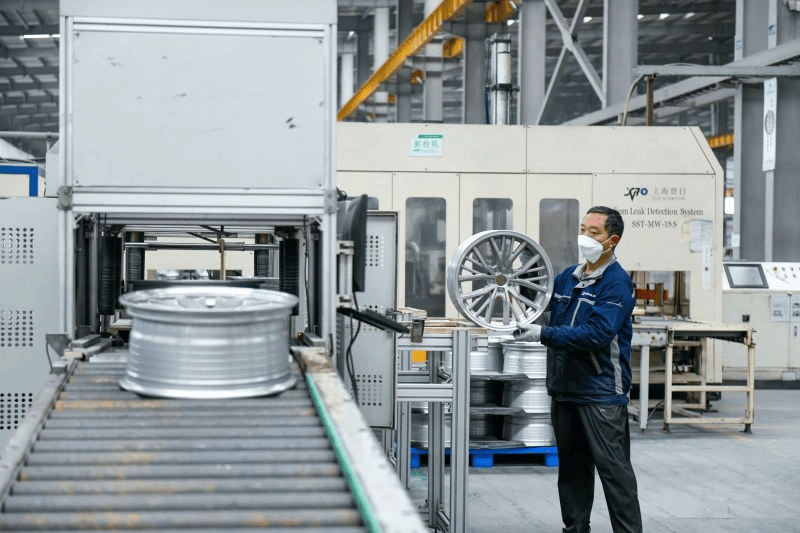 2024年,该公司引进了先辈的旋压机设备,本年投入利用。机械人扭转手臂,进行预热、辐条冷却、减压、快速冷却四步细密功课。蒋送春说:“24小时能够旋1000个,不到两分钟旋1个。新的工艺提拔了产质量量的靠得住性。产物比通俗轮毂轻1到1。5公斤。”。